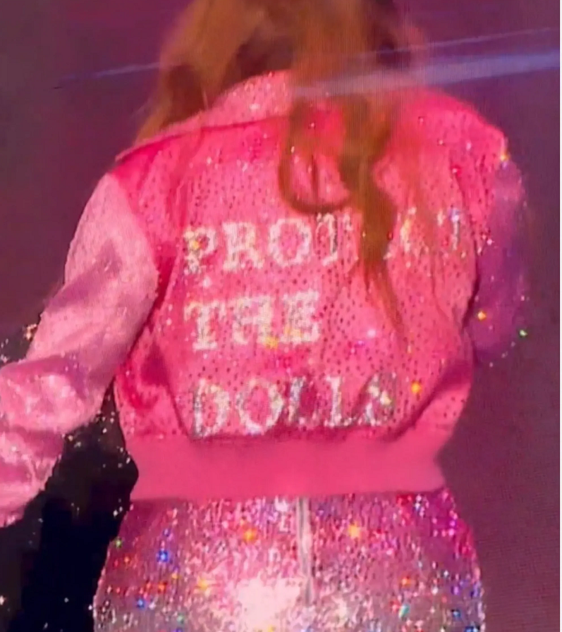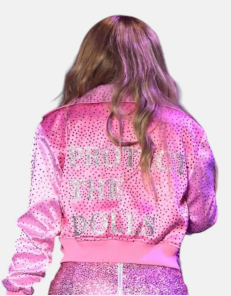 Made from premium-quality fabric with a soft satin finish, it features the standout “Protect the Dolls” graphic detail, symbolizing empowerment and confidence. The vibrant pink color brings a playful yet stylish edge, while the full-zip front, ribbed cuffs, and snug waistband offer comfort and a flattering fit. Perfect for fans, collectors, and fashion lovers who want to channel their inner superstar with every step.