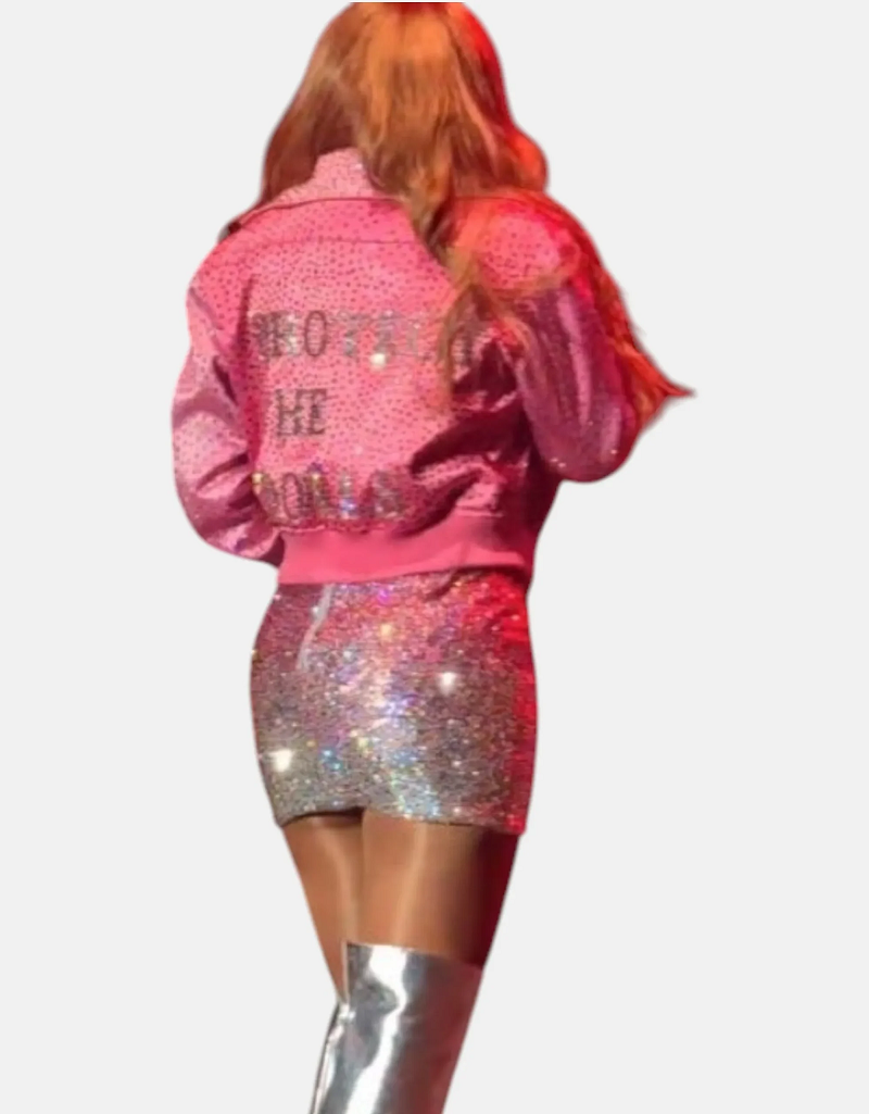 Mariah Carey Brighton Pride 2025 “Protect the Dolls” Pink Studded Bomber Jacket