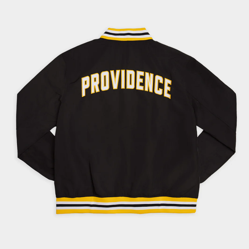 Crafted from high-quality satin polyester, the jacket offers a smooth, lightweight feel with a timeless sheen. The classic black and white colorway mirrors Providence’s proud team colors, while the embroidered 1987 graphics and Friars basketball logo pay homage to the glory days of Coach Rick Pitino’s squad. The rib-knit cuffs, collar, and waistband add a snug, athletic fit that channels authentic 80s varsity style.