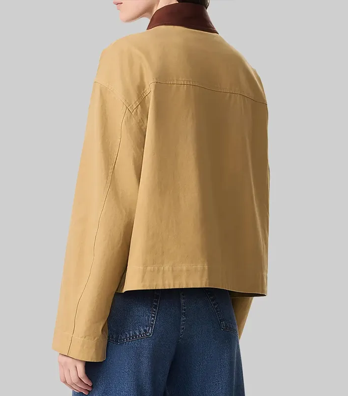 Crafted from premium brown cotton, the jacket offers a soft yet durable feel with a relaxed fit perfect for layering. It features a classic button-front closure, shirt-style collar, and multiple pockets for a timeless utilitarian touch. Lightweight yet stylish, it channels Zegler’s signature low-key glam while keeping you comfortable on the move.
