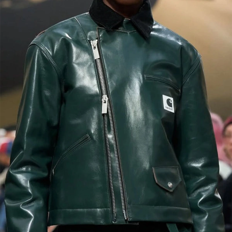 Constructed from premium genuine leather, the jacket showcases a two-tone green and brown palette that highlights both brands’ aesthetic signatures — industrial edge meets elevated street style. The design features structured paneling, utility-inspired pockets, and Sacai’s signature hybrid tailoring, combining function with fashion-forward detailing. A front zip closure, adjustable cuffs, and a smooth inner lining ensure comfort without compromising on sophistication.
