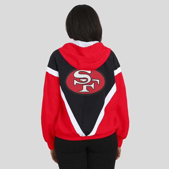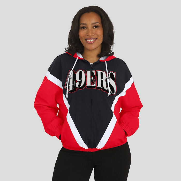 Constructed from crinkle-textured fabric for a nostalgic feel, it features a striking black-and-scarlet color-block layout inspired by vintage sideline gear. The full-zip front, stand-up collar, and elastic cuffs deliver a secure fit, while official 49ers graphics add an unmistakable touch of team loyalty.