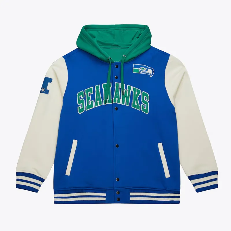 Made from premium satin-finish polyester, it features a royal blue body with contrasting eggshell sleeves, echoing the retro sideline styles worn by players and coaches on game day. The Seattle Seahawks logo is prominently displayed across the chest and sleeve, celebrating your loyalty to the Pacific Northwest’s finest.