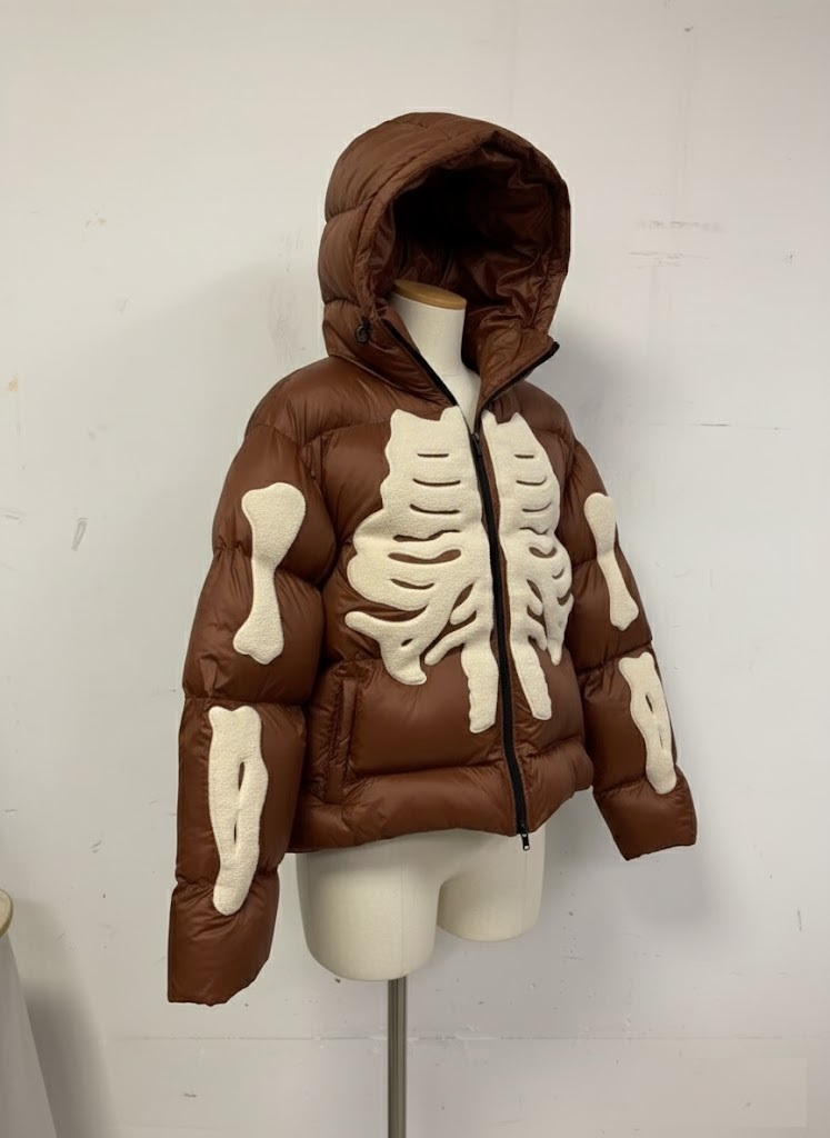 Dare to stand out with the Bone Skeleton Puffer Jacket—a fusion of edgy design and superior winter comfort. This isn’t just a jacket; it’s a conversation starter. Featuring a striking white bone skeleton design overlaying a rich Brown exterior, this puffer is built to turn heads while keeping you genuinely warm.