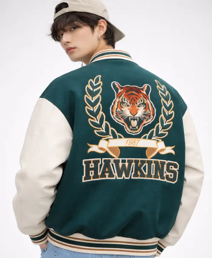 The jacket proudly displays the legendary Tigers mascot patch and bold “Hawkins” lettering in high-density chenille embroidery, offering a textured, vintage feel. Designed with a traditional varsity silhouette, it includes a classic snap-button front, a comfortable stand-up collar, and striped rib-knit cuffs and hem to lock in warmth. The interior is lined with a smooth, quilted viscose fabric, making it a perfect choice for both chilly Upside Down adventures and everyday streetwear. Whether you’re a die-hard fan of the show or a collector of retro collegiate style, this jacket delivers the perfect blend of cinematic history and timeless varsity craftsmanship.