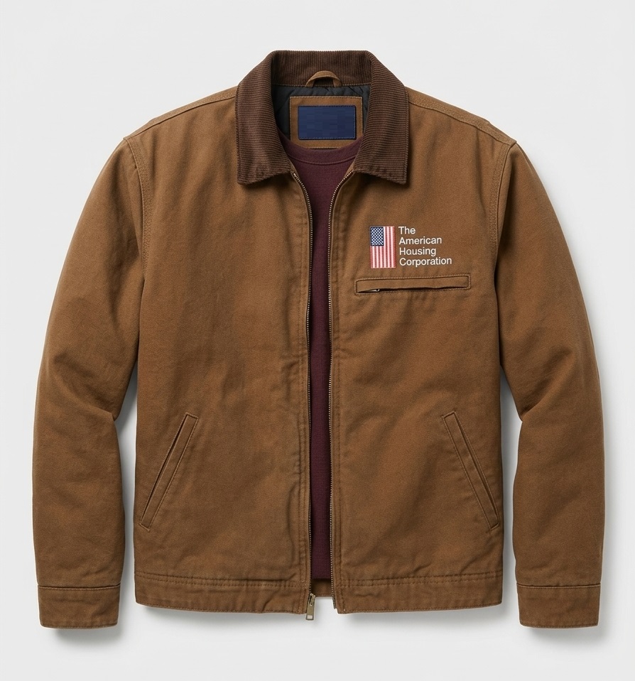 The rich brown canvas is complemented by a sophisticated classic collar and a smooth viscose lining on the interior, ensuring maximum comfort and breathability throughout the day. Designed with a relaxed fit, it provides ample room for layering without sacrificing a sharp, structured look. Featuring a secure zipper closure and finished with the signature American Housing Corporation printed logo on the chest, this jacket is the perfect blend of functional utility and heritage-inspired design.