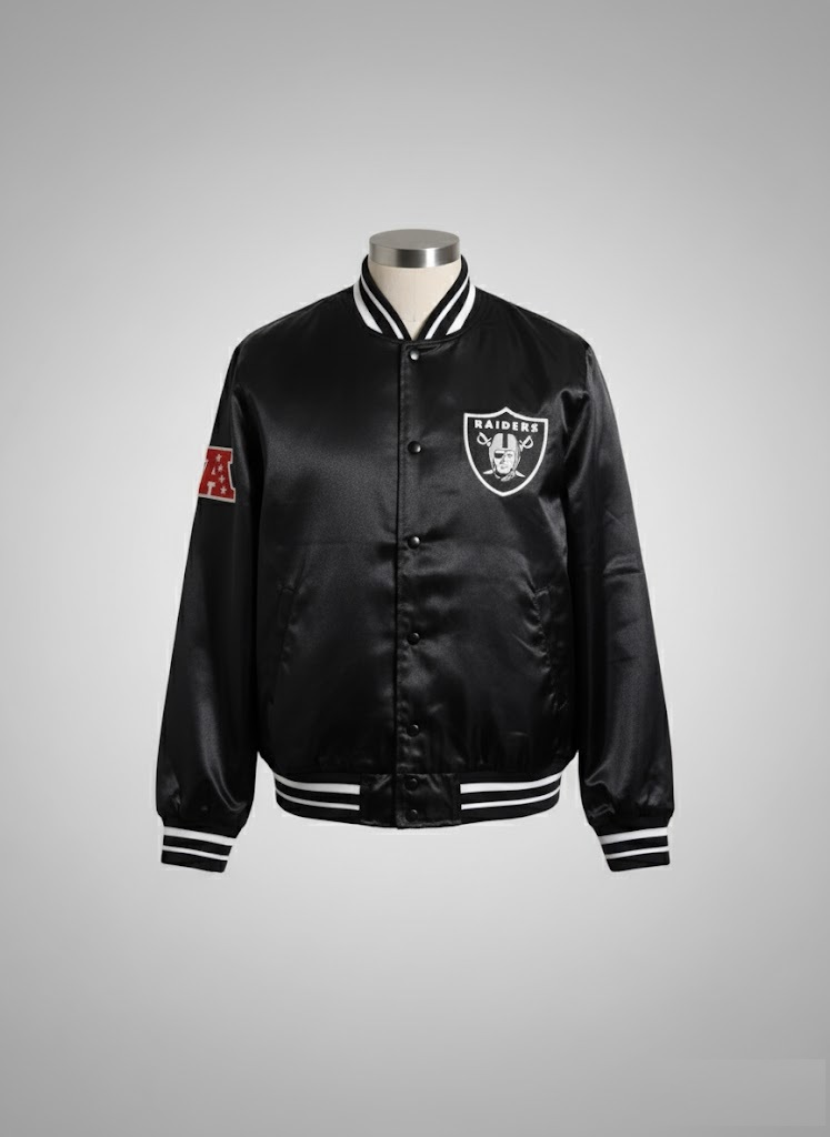 Elevate your game-day style with the Men’s Black Las Vegas Raiders Exclusive Satin Full-Snap Varsity Jacket. Crafted from 100% premium polyester satin, this jacket delivers a sleek, smooth finish that stands out effortlessly. The classic rib-knitted collar and rib-knit cuffs add durability and structure, while the snap-tab buttoned closure gives it an authentic varsity look.