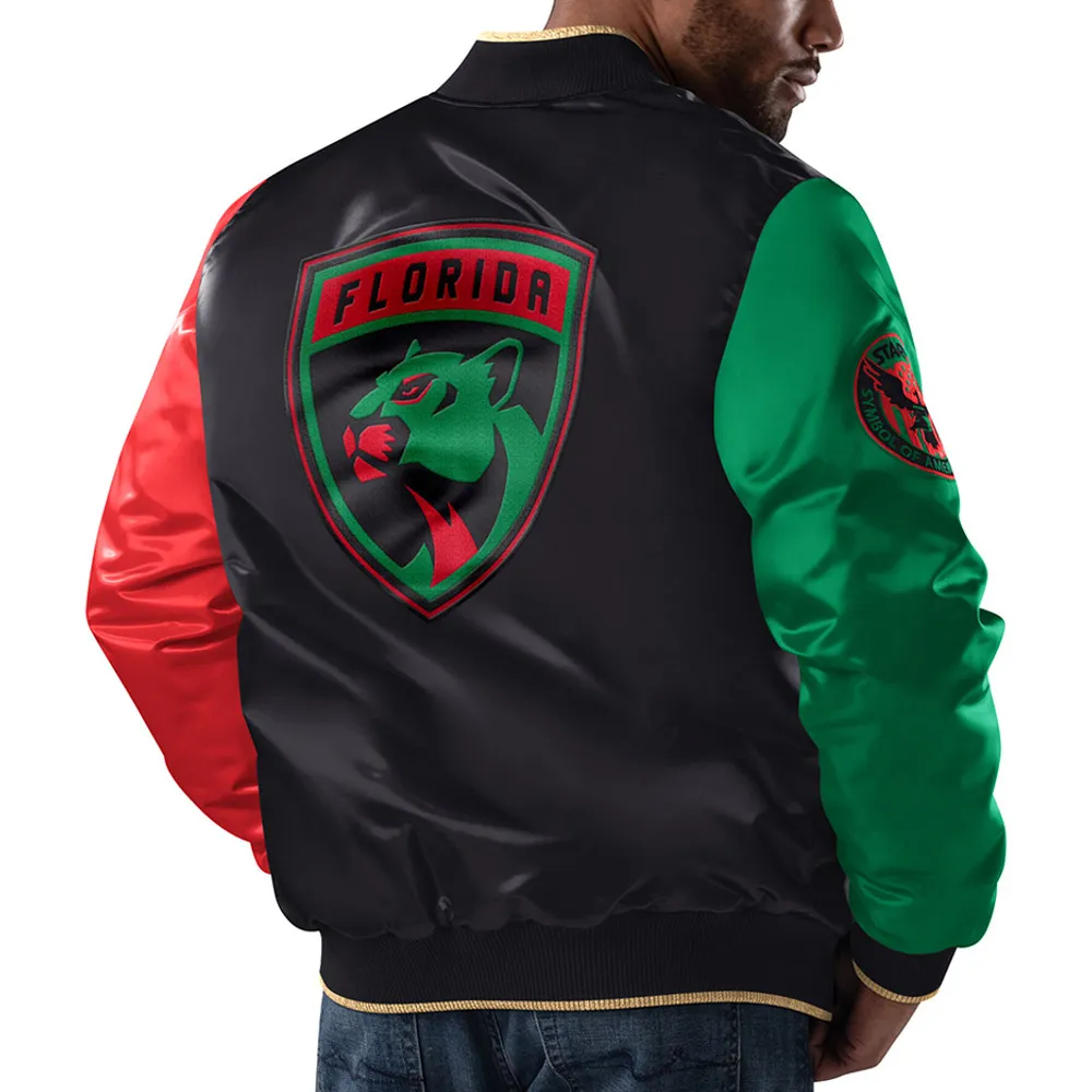 The jacket features a vivid multi-color design with prominent Florida Panthers logos, historic symbolism, and standout embroidered patches. With premium materials and a satin sheen finish, it delivers a mix of retro sportswear and cultural storytelling — perfect for game day or everyday flex.