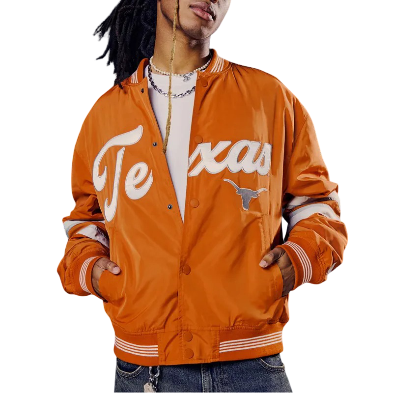 Crafted from durable yet lightweight materials, it features embroidered Longhorns logos, team patches, and standout Texas color blocking. The ribbed collar, cuffs, and hem provide a snug, athletic fit, while a snap-button or zip-front closure adds versatile wearability. Whether you’re tailgating, hitting the stands at DKR Stadium, or just repping your school pride, this jacket says “Hook ’em Horns” loud and proud.
