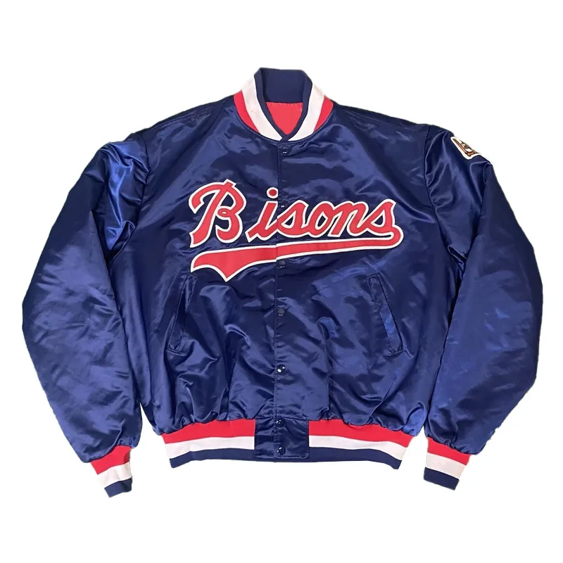 Show off timeless team spirit with the Vintage Buffalo Bisons Baseball Blue Full Snap Satin Jacket. Featuring a rich blue satin finish and classic Bisons logos, this retro-inspired jacket celebrates the team’s storied history in standout style.