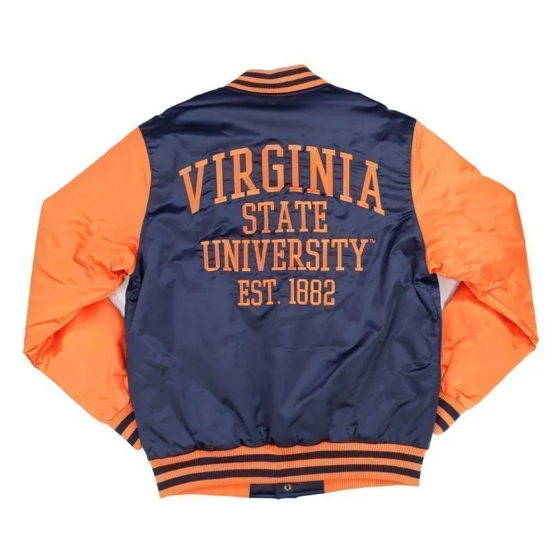 Elevate your game day style with the Virginia State Navy and Orange Baseball Jacket, a perfect blend of comfort and school pride. Made from 100% premium satin fabric, this jacket boasts a smooth, glossy finish that stands out in any crowd. The snap-tab buttoned front closure offers a classic varsity look, while the front welt pockets provide both convenience and style. With a relaxed fit and full-length sleeves, this jacket is designed for comfort and versatility. The soft viscose lining ensures all-day coziness, making it an ideal choice for chilly days. Show off your Virginia State spirit with the vibrant navy and orange color combination, a timeless symbol of Trojans pride.