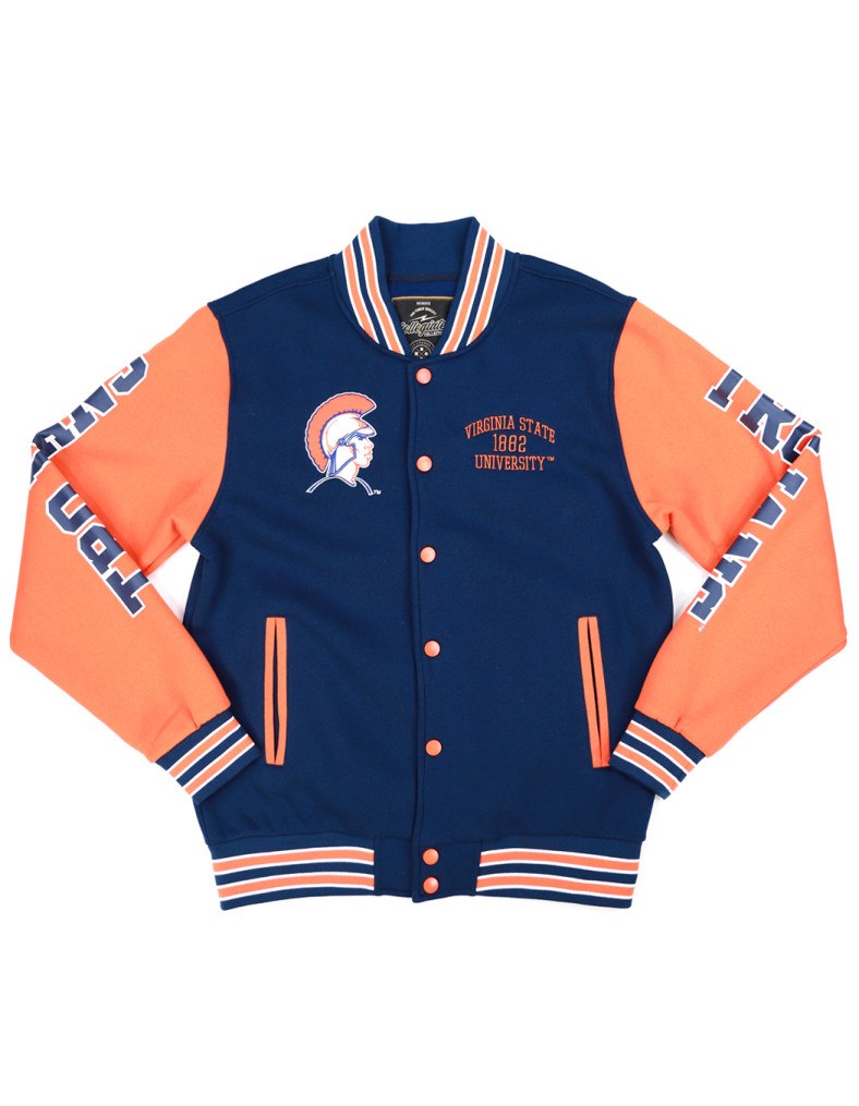 Show your Virginia State University pride with this stylish and comfortable Men’s Fleece Jacket. Made from a high-quality blend of 60% cotton and 40% polyester, this jacket delivers both warmth and durability. The snap-tab buttoned front closure adds a classic varsity touch, while the front welt pockets provide practicality and style. Designed for a relaxed fit, it ensures all-day comfort, making it perfect for game days, campus wear, or casual outings. The soft viscose lining enhances breathability and warmth, while the full-length sleeves complete the timeless look. Available in the signature navy and orange color combination, this fleece jacket is a must-have for any Virginia State Trojans fan.