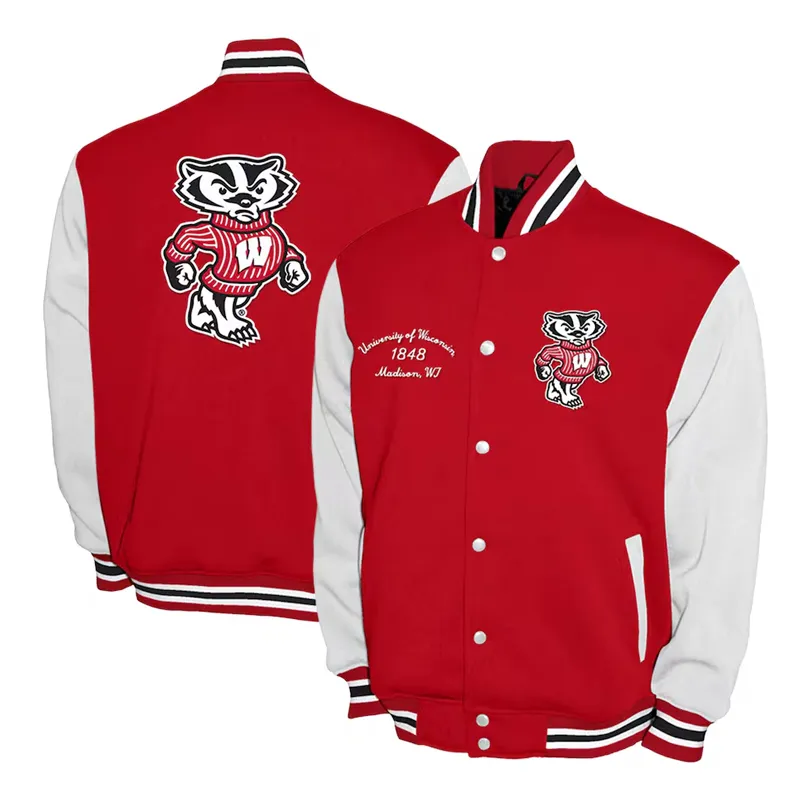 Show off your Badger pride in timeless collegiate style with the College NCAA Wisconsin Badgers Cardinal and White Varsity Jacket — a must-have for every loyal University of Wisconsin fan. Combining classic varsity aesthetics with premium craftsmanship, this jacket celebrates the Badgers’ fierce legacy both on and off the field.
