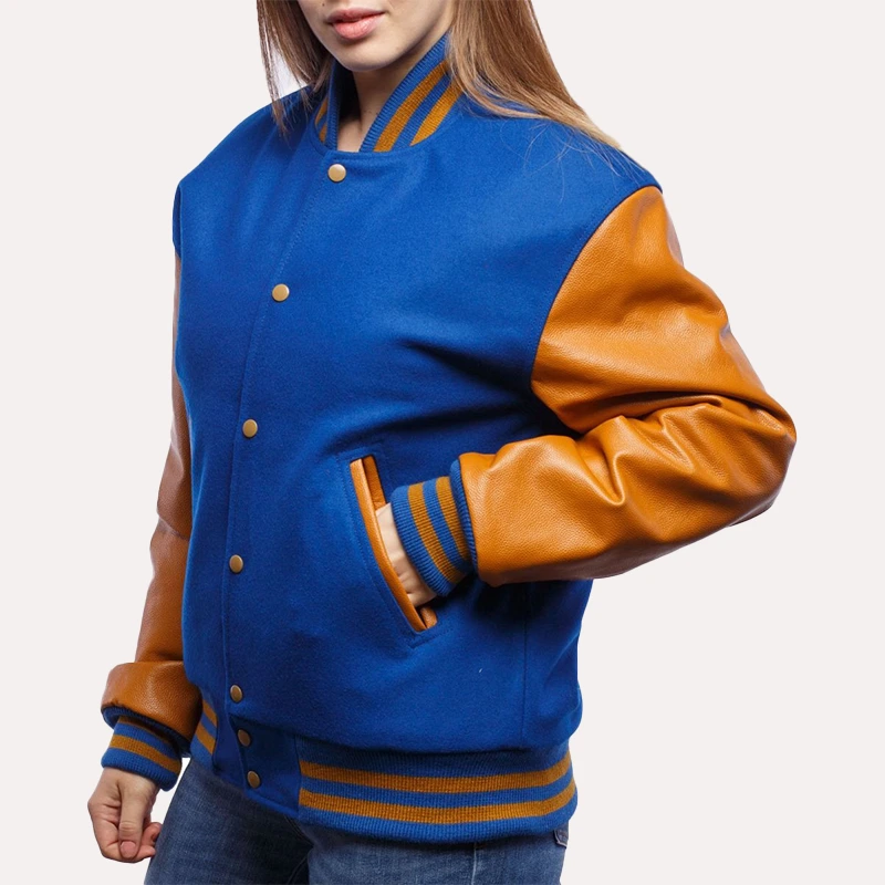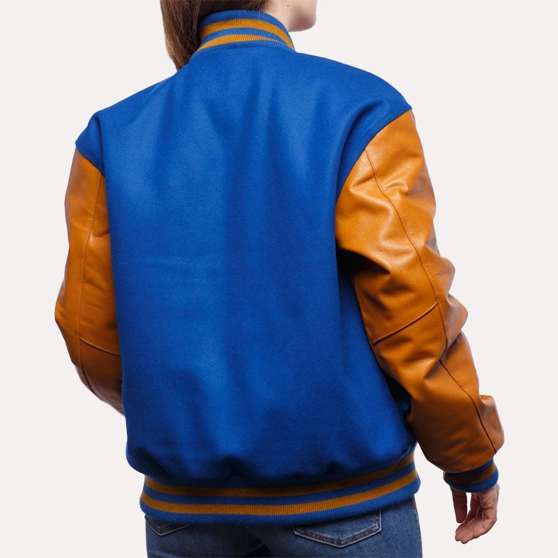 Womens Blue and Gold Leather Sleeves Varsity Jacket